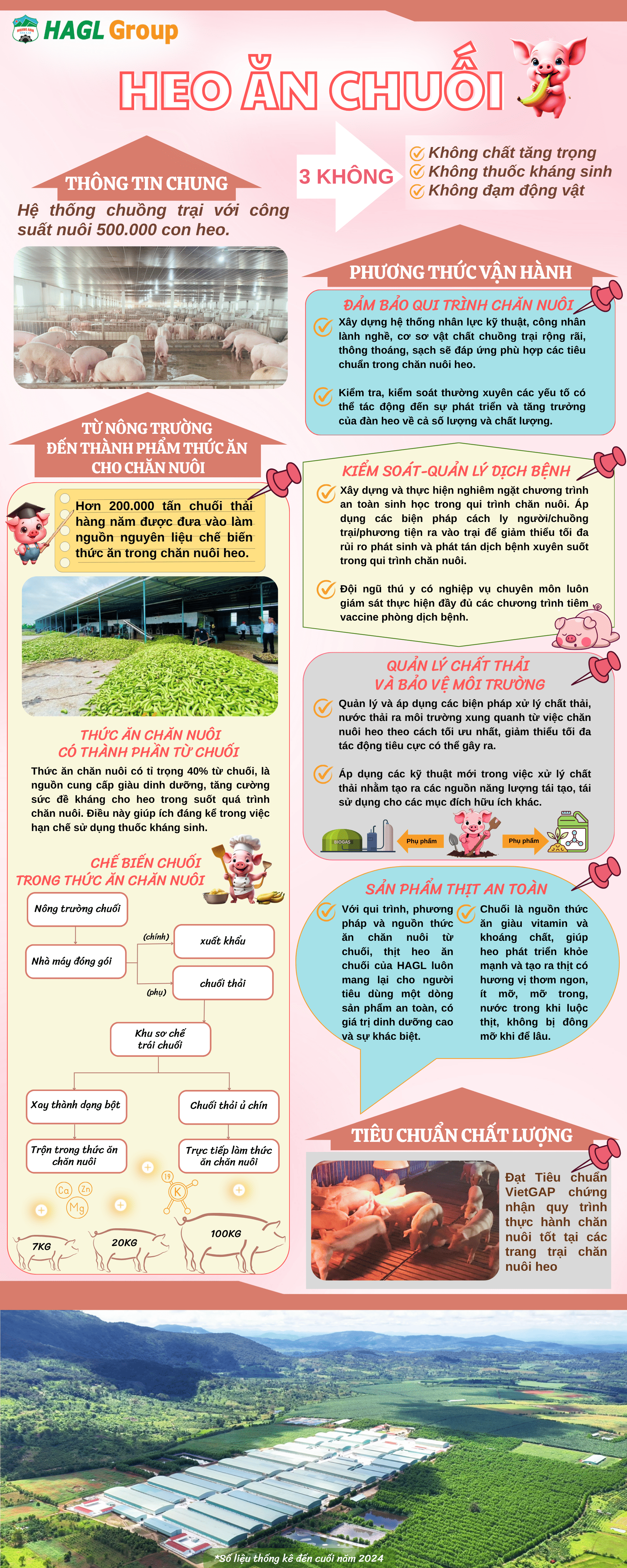 Heo ở HAGL được nuôi theo quy trình khép kín với thức ăn chủ lực là trái chuối trồng xuất khẩu của HAGL với tiêu chuẩn “ba không”: không thuốc kháng sinh, không sử dụng chất cấm, không đạm động vật. Thức ăn chăn nuôi heo sử dụng các loại thảo mộc thiên nhiên thay thế kháng sinh, giúp giữ ấm cơ thể và đường tiêu hóa khỏe mạnh, kích thích heo ăn ngon, hấp thu dinh dưỡng tốt để tăng đề kháng tự nhiên, hạn chế đau ốm. Sử dụng đạm thực vật thay thế là đậu nành, bắp, bổ sung vi lượng nhập khẩu. Để bảo vệ sức khỏe người tiêu dùng, thức ăn chăn nuôi heo HAGL không sử dụng chất cấm mà nguyên liệu hoàn toàn từ thực vật an toàn.